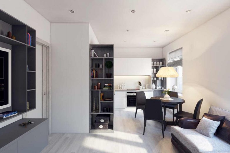 Приподнять потолки поможет их глянцевая поверхность и небольшие софиты, встроенные в потолок. Светлые краски в интерьере должны преобладать в небольших квартирах, тогда оптический обман сделает свое дело.