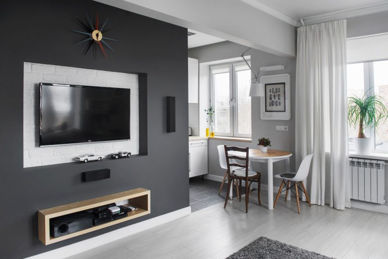 Современные телевизоры очень плоские и размещаются в основном на стене. Такой ход позволяет не занимать место дополнительной тумбочкой.