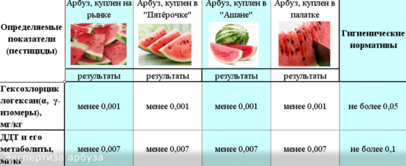 На испытания поступило четыре образца свежего арбуза: арбуз, куплен на рынке; арбуз, куплен в «Пятёрочке»; арбуз, куплен в «Ашане»; арбуз, куплен в палатке.