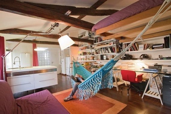 Также и мансарда имеет несомненно оригинальную связь с внешним миром благодаря предлагаемому виду из нее. Однако, внутри помещения есть и другие места, в которые можно поместить гамак.
