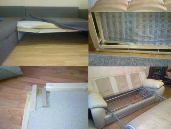 В начале определимся с характером дефекта, который необходимо устранить. От этого будет зависеть, что именно будем разбирать для устранения. Произвести разборку элементов объекта можно путем снятия облицовочного, набивочного и других материалов, а так же пружин, фурнитуры и других элементов мебели.