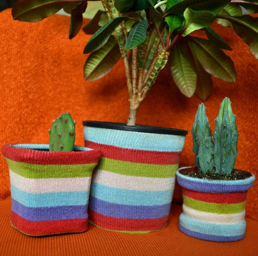 Самый простой из вариантов, найденных мною, наверное, этот. В качестве «одежды» для горшков в таком варианте можно использовать цветные носки, колготки, ну в крайнем случае, рукава от старой кофты. По моему мнению, у автора получилось очень красочно и в то же время по-домашнему уютно.