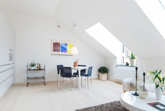 Квартира имеет интерьер в нордическом стиле, с белыми стенами и потолком, в целом, она предлагает светлый и минималистический дизайн. Наклонные потолки, конечно, визуально уменьшают пространство, но в то же время у них есть специфическое преимущество: они позволяют создавать окна в крыше с видом на небо, что несомненно является отличным дизайнерским решением для любого типа апартаментов.