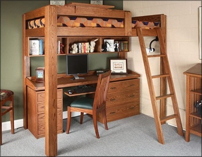 1. Подростковая кровать с рабочей зоной внизу.Такой вид размещения устраивает подростка во всем. Кровать-чердак (подростковая) позволяет удобно и компактно разместить зону для занятий. В образованной нише свободно помещается рабочий или компьютерный стол, полки для книг, тумба и еще много необходимых мелочей. Единственная проблема – это степень освещенности пространства. Но если оборудовать эту нишу стильной, функциональной настенной или настольной лампой с регулировкой направления света, то проблема с успехом будет решена.