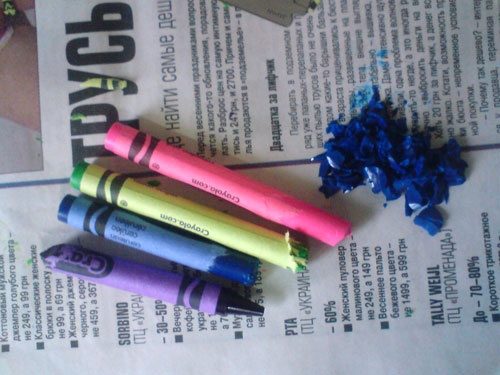 2. Сделать разноцветную стружку из мелков. И развести её в растопленном парафине.