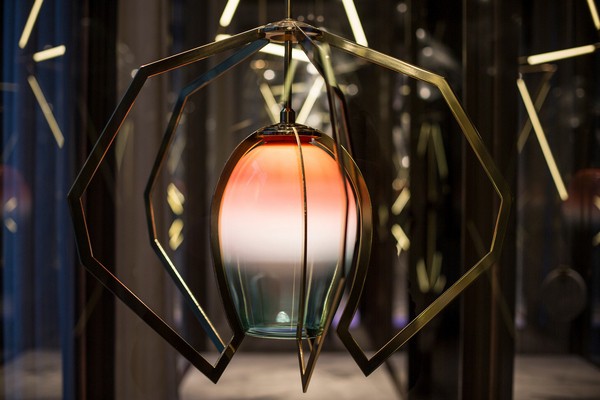 Люстра получила название «Vise» и была создана американским дизайнером Bec Brittain. Двуцветную внутреннюю часть поддерживает латунный каркас, немного напоминающий паучьи лапки, — так же, как и плафон, он создавался вручную. Декоративная люстра необычной формы дает мягкий, немного приглушенный, благодаря градиентной окраске стеклянного плафона, свет.