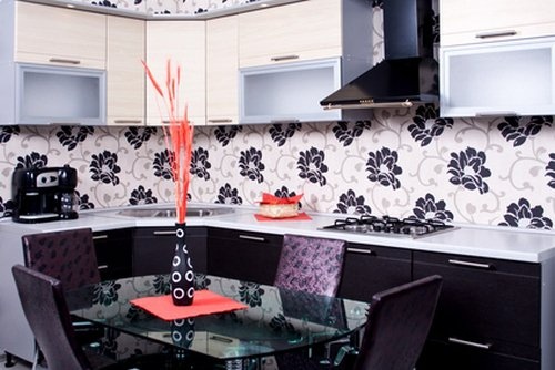 Эффектным решением для кухни может стать фартук из стекла. Подобно плитке, он устойчив к жиру, влаге и высоким температурам – главным врагам кухонной обстановки. Для украшения стекла используются самые разные технологии: это может быть простое матовое стекло, узоры, выполненные методом пескоструйной гравировки, фотопечать, позволяющая наносить любые изображения — пейзажи, фотопанорамы и др.