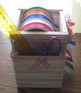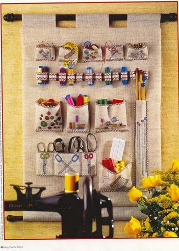 Этот органайзер сделан из… палочек для мороженого. Идея замечательная, главное удобно хранить ленты. Рулоны лент всегда будут в порядке — не размотаются. И всегда можно отрезать необходимое количество ленты нужного цвета. Кстати и карман для ножниц, как Вы видите тоже есть.