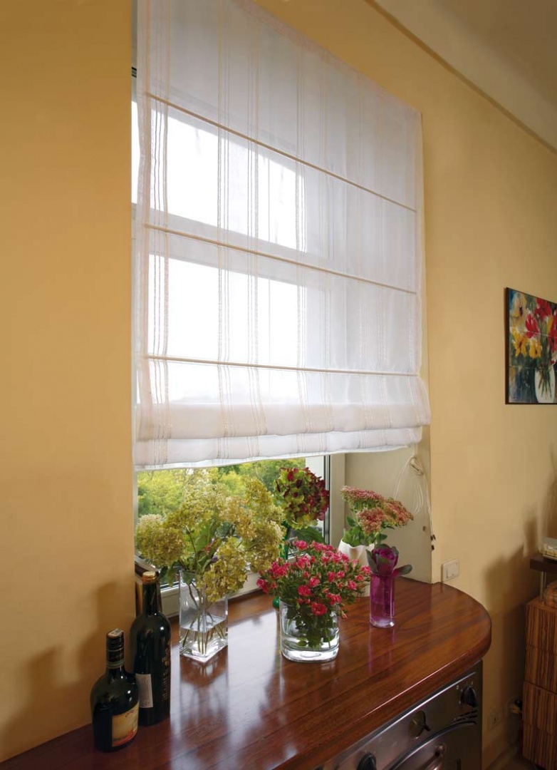 Ее строгость подчеркивает элегантность. В поднятом виде она образуют мягкие складки, напоминающие слоеный ламбрекен, а в опущенном — становится плоской с ярким рисунком от солнечного света.