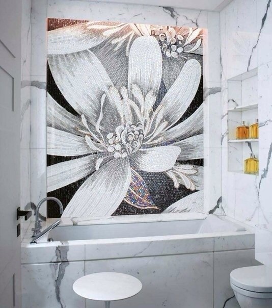 Используется мозаика в отделке не только стен, но и пола, потолка, экрана для ванны, других поверхностей в дизайне ванной. Кроме однотонной поверхности можно получить различные узоры, композиции и орнаменты, если комбинировать мозаику различных цветов.