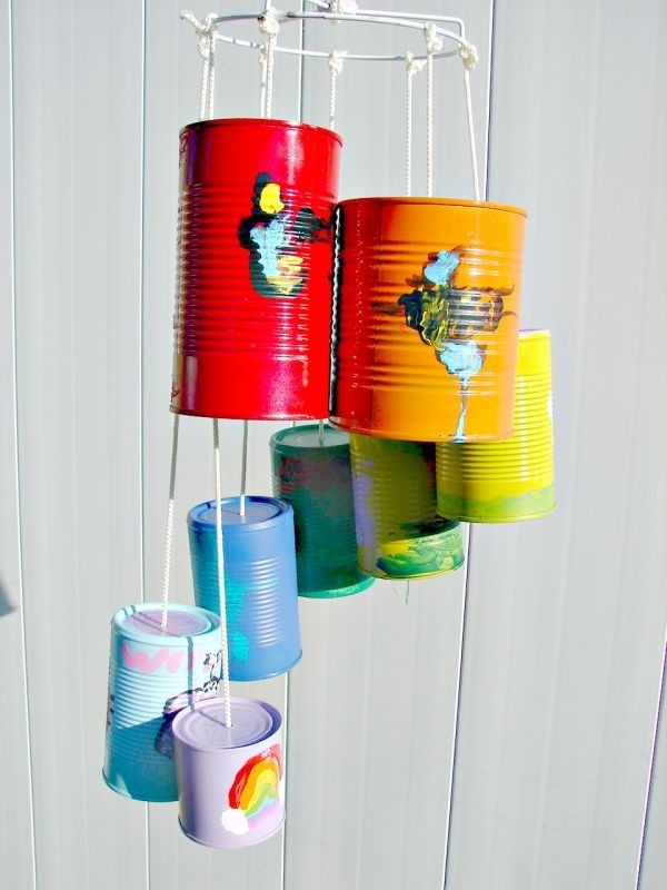 Если у вас есть несколько пустых металлических банок, то их можно использовать для создания той самой музыки ветра. Просто покрасьте банки в различные цвета, сделайте небольшое отверстие в дне банки и затем закрепите при помощи веревки или лески. Используйте вязаный обруч или любой другой предмет круглой формы в качестве основания.