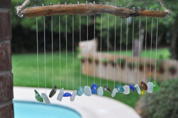 Галька, подобранная на пляже, также может стать отличным колокольчиком. Для этого проделайте небольшое отверстие в каждом камне и закрепите их на основании из дерева, добавив на конец нити бисер для ее закрепления.