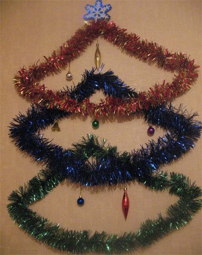 Как видите, очень простой вариант сооружения елки своими руками. Также можно ее сделать, например, не из мишуры, а из гирлянды, будет смотреться ничуть не хуже, а возможно даже лучше. Также некоторые делают елки из собранных веток, и вешают их на стене леской, либо прикрепляют двухсторонним скотчем. Еще один вариант, это нарисовать ее самой, например, на ватмане, или на обычной доске. Так же очень интересный вид елки, это сделать ее из шерстяного клубка для вязания. Просто вешается на стене вместо мишуры в виде зигзагообразной елки. Да и вообще, елку можно сделать из любых подручных материалов, главное желание. Экспериментируйте и создайте свой шедевр, и ваши родные и близкие обязательно это оценят. С Наступающим вас!