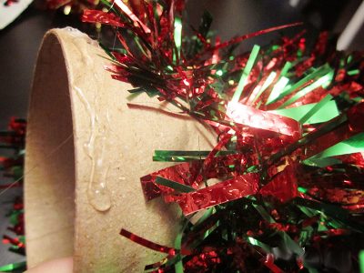 Получается вытянутая пирамида. Начиная с вершины пирамиды обматываем болванку мишурой, приклеивая мишуру клеем на каждом витке. Мишура достаточно плотно сидит на пирамиде и без клея, но необходимо все равно на вершине и внизу на последнем витке закрепить мишуру клеем (можно использовать жидкие гвозди).