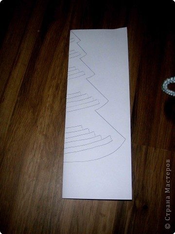 3. Складываем лист пополам, вырезаем форму елочки. На елочке делаем разрезы, например, как на образце.