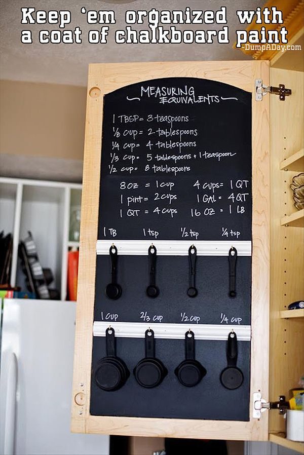 Вот так можно раз и навсегда разобраться с мерными ложками – просто повесьте их на меловую доску на дверь шкафа с внутренней стороны.