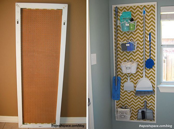 Если в ванной есть свободное место, повесьте на стену перфорированную панель, чтобы удобно хранить на ней швабры, веники и т.д.