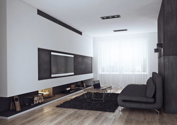 Дизайн интерьера является минималистическим. Гостиная имеет белые стены и деревянные полы, украшена темно-серым диваном, который легко можно превратить в кровать. Современный камин добавляет немного тепла в общее пространство, но без излишнего уюта.