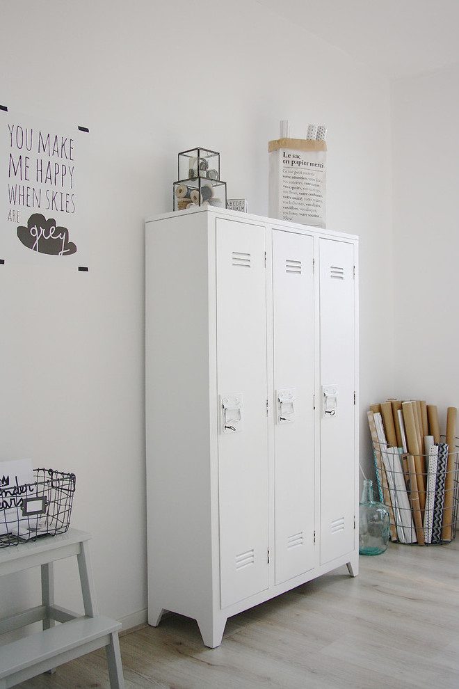 Справа от кухни — белые шкафчики, которые часто можно увидеть в раздевалках и школах. Хотя они выглядят немного не по-домашнему, Карлин очень нравится эта деталь интерьера. Отчасти потому, что шкафы довольно вместительные, и в них достаточно места для всех вещей, которые она использует в работе.