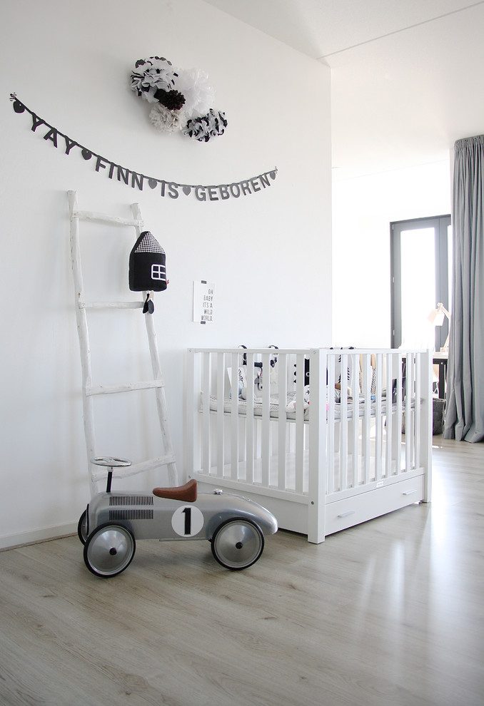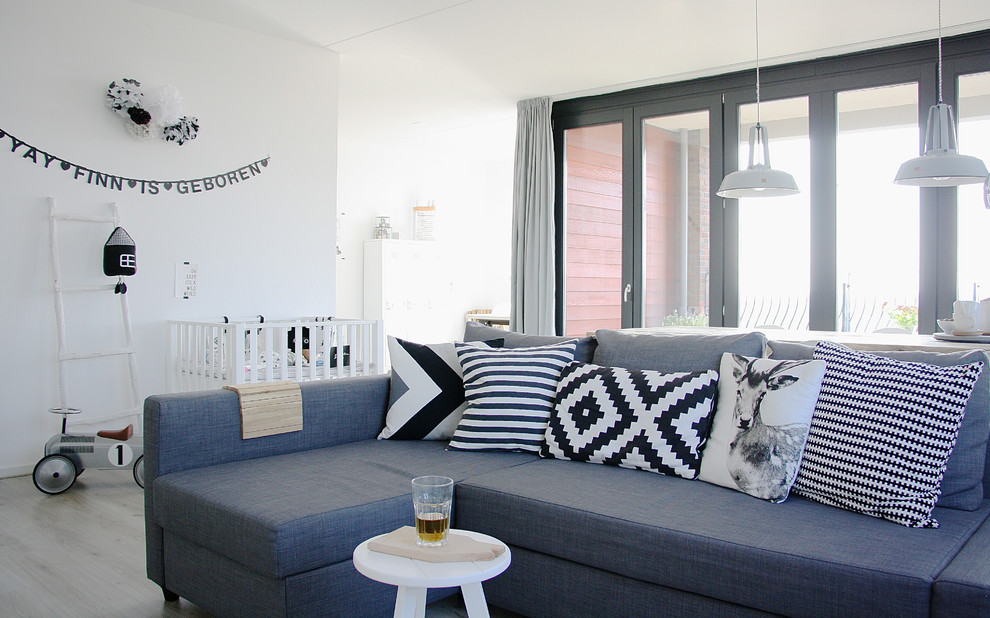 Отдельную часть гостиной хозяева оборудовали для своего сына Финна. Бумажные черно-белые помпоны над гирляндой Карлин и Питер сделали сами.