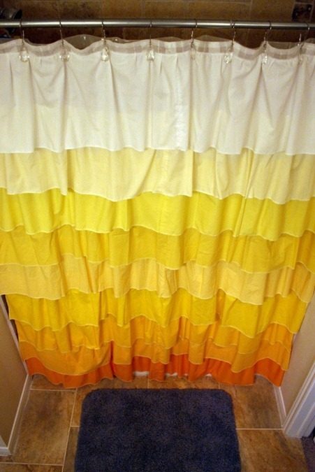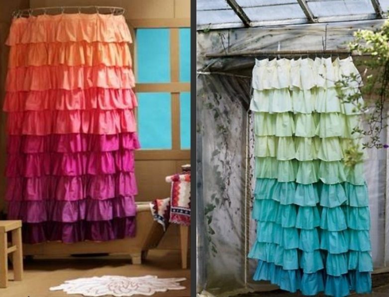 Теперь пробелы заполните оставшимися отрезами, соблюдая цветовую гамму. У вас должен получиться переход цвета. Теперь осталось повесить эту штору поверх старой (ее убирать не нужно, так как она будет продолжать выполнять свои непосредственные функции – защиту пола от воды).