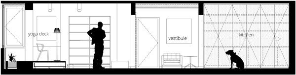 Раздвижная дверь справа от вестибюля ведет в гардеробную — комнату, где раньше находилась кухня. Небольшая часть комнаты, серый помост, отведена для занятий йогой. Это помещение также служит зимним садом. В комнате стоит нестандартный синий шкаф-витрина с неглубокими полками.