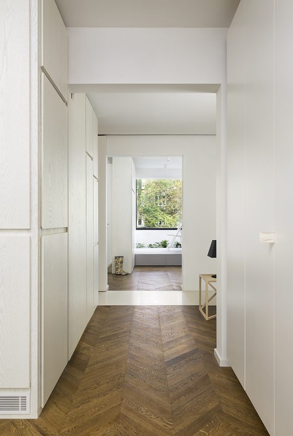 Квартира расположена на первом этаже старинного дома. Основной задачей дизайнеров было максимально увеличить количество дневного света, поступающего в комнаты, и при этом создать современный интерьер. Без перепланировки не обошлось: вестибюль увеличили за счет сноса стен маленького хозяйственного помещения, а кухня переехала на новое место. Там, где была старая кухня, появилась дополнительная комната.
