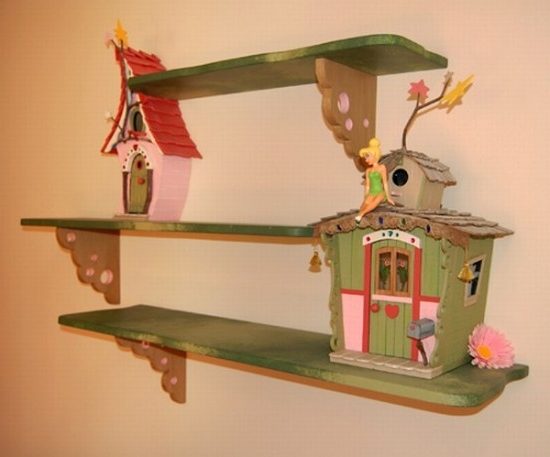 Универсальным вариантом является дерево. Чаще всего такие полочки изготавливаются под заказ, и в них присутствует элемент настенной живописи. Все просто – на одной из стен рисуется дерево (рисунок подбирается на ваше усмотрение), а к его ветвям приделываются отдельные полочки. Их порядок, размер и количество также выбираете именно вы. В данном случае важно рассчитать все так, чтобы малышу было удобно играть в такой комнате, чтобы он не ударялся головой о стеллажи, и они не мешали подвижным играм.