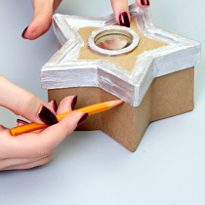 2. Шкатулка, которую я выбрала для украшения мозаикой, имеет сложную форму звезды с зеркальцем на середине крышки. Тонкие бортики на крышке сложно украшать мозаикой — покрасьте их белой перламутровой краской.