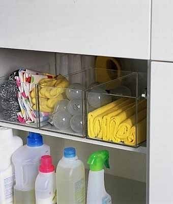 Собранные вместе чистящие средства помогут не тратить время на их поиск. Полочка в нише – отличная идея для хранения мочалок, тряпок, резиновых перчаток, порошков и чистящих жидкостей.