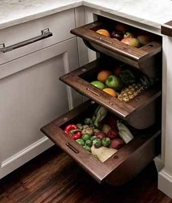 Где удобнее всего хранить овощи? Конечно, ближе к месту их обработки. Шкаф с выдвижными ящиками недалеко от кухонной мойки – отличная идея для хранения овощей.