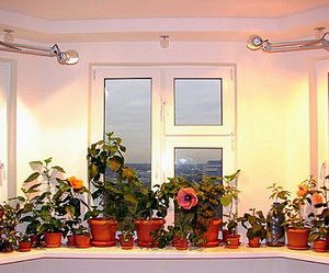 Сама я сделала выбор в пользу люминесцентных ламп, они бывают нескольких типов от 15 до 58 ват. Я использую L 18W/77, мощность – 18 Вт, световой поток – 550 лм. У лампы очень приятный нежный розово-фиолетовый свет и растения под этим освещением смотрятся естественно и красиво. Для подсветки цветов на северных окнах зимой мне вполне хватает одной такой лампы на метр длины подоконника, ширины где-то 20 см. С такими условиями освещения большинство моих горшечных растений не только комфортно переживают зиму, но и хорошо развиваются.