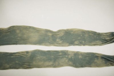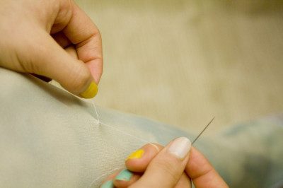 После того, как колготки высохнут, используйте иголку с ниткой для того, чтобы сделать первый узел на них.