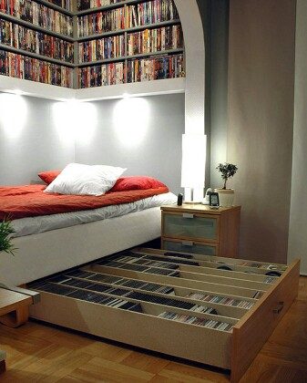 Кровать можно использовать более рационально, чем это предполагает её прямое назначение. Подкроватное пространство – это обычно выдвижные ящики, в которых мы храним постельное бельё. Но их можно задействовать и для хранения других вещей – например, книг.