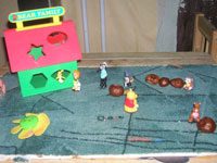 Для того чтобы после игры не утомлять себя раскладыванием этих игрушек на полочки или в коробочки, я, например, приклеиваю к ним одёжную липучку. Так они замечательно удерживаются на куске ковролина, который автоматически выполнят функцию полянки. Так же можно поступить и со всем другим, что подходит по размеру и может стать домиком, мостиком и т.д. Плюс — всё это можно одним махом убрать со стола, просто убрав коврик.Таким же образом можно поступить со своим подножным ковром (если только на нём липучка держится), сделав несминаемую дорогу для машин, несдуваемые цветочки, озеро из ненужного CD и пр.