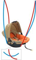 Автокресло для новорожденных легко может превратиться в съёмную люльку-качалку, подвешенную к потолку (прямо как в старо-сказочные времена). Поясняю: в автокресле есть специальные такие пазлы, куда продевается ремень безопасности, крепящий автокресло к сиденью. Причём они, естественно, сделаны для обеих сторон, всего четыре: два на верхней части кресла (где голова), два на нижней (где ножки).
