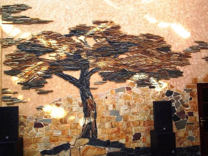 Другой вариант – телевизор в центре композиции. Большой плазменный экран на фоне камня смотрится потрясающе.