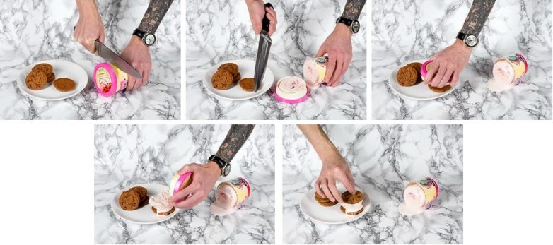 Чтобы во время приготовления такого сэндвича не измазаться мороженым, нужно просто резать его ножом прямо с упаковкой. Положить ломтик на печенье, убрать кольцо обертки, накрыть другим печеньем.