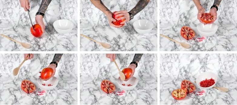 Надрезать плод по периметру, руками разломать его пополам. Одну половину раскрыть, положить стороной с семенами на ладонь и начать энергично стучать по гранату деревянной ложкой до тех пор, пока все семена не вывалятся. Занимает это и правда секунд 10.
