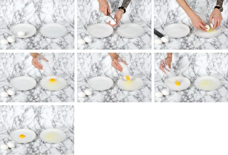 Если не получается сделать это привычным переливанием яйца из одной половины скорлупы в другую, пригодится пустая пластиковая бутылка. Нужно поднести горлышко к желтку и нажать на бутылку — желток всосется внутрь, и его можно будет перенести и выдавить в отдельную миску.