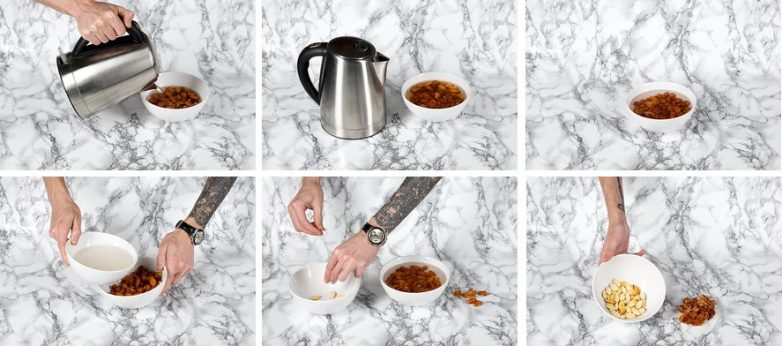 Орехи (жареные, сырые — неважно) замочить в кипятке на 10 минут, воду слить. Залить холодной водой, а затем еще раз кипятком на те же 10 минут. Обмакнуть орехи полотенцем, а потом каждый немного стиснуть — ядра сами будут выскакивать из шкурки. Внимание: с фундуком такой фокус не пройдет.