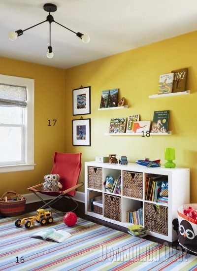 Свежая желтая краска в детской составляет контраст состальным пространством дома, оформленным в серых оттенках.Узкие полки для картин – очень удобное место для детских рисунков, книжек и всего самого дорого и необходимого. И совсем не отнимают у комнаты свободного пространства.