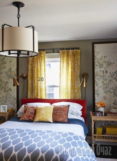 Эти шторы очаровали хозяйку дома, однако ей совсем не подходило готовое оформление их верхнего края. Так что люверсы (вшитые вткань кольца) она заменила на мягкие французские складки. Прикроватные столики из бамбука смотрятся легко и изящно. А подушки с этническими мотивами завершают оформление.