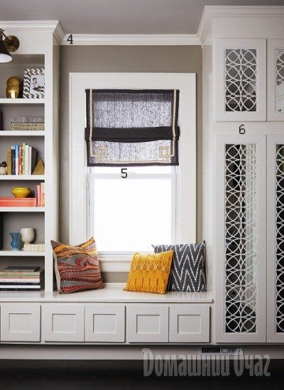 Группа ярких диванных подушек разбавляет цветовую палитру и делает встроенный диванчик по-настоящему комфортным и уютным.