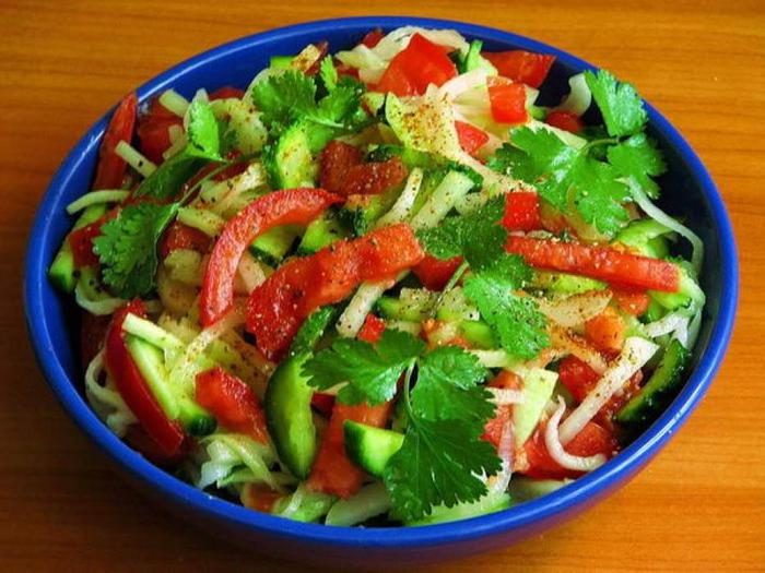 Пикантная история. Чтобы придать остроты и оригинальности салату, не жалейте специй. Экспериментируйте, смешивайте, но знайте меру – вкус овощей тоже должен быть различим. Только следите, чтобы в пакетиках с приправой Вам не попадалсяглутамат натрия. Лучше покупайте специи в специализированных лавках.