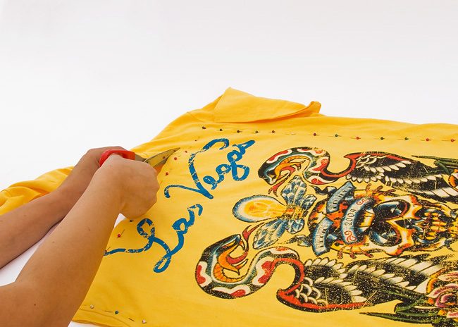 Футболку ровно раскладываем на столе, проглаживаем. Булавками намечаем прямоугольник на футболке и вырезаем его, учитывая припуски 1-1,5 см.