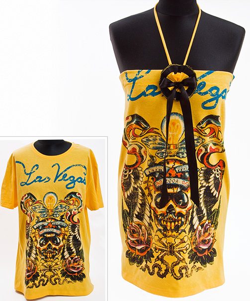Из широких мужских футболок можно сшить огромное количество стильных женских нарядов. Например, из футболки с крупным рисунком получился такой яркий сарафан-туника на тонких бретельках.