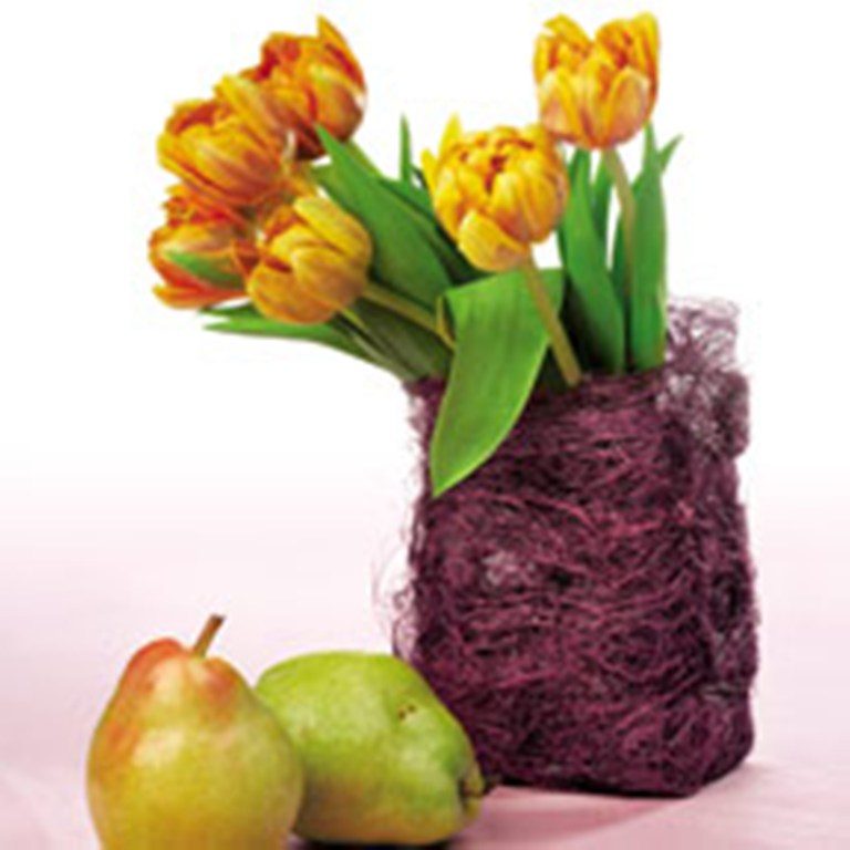 Разведите клей ПВА водой до консистенции молока. Квадраты положите на стол и смочите раствором. Поставьте в центр вазу и, подняв края квадрата кверху, приглаживайте их руками к бокам вазы. Распределяйте волокна равномерно по поверхности.