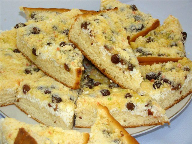 Противень смазываем маслом, высыпаем крошку (примерно пятую часть оставляем для верха пирога), разравниваем и слегка прижимаем ладошкой.