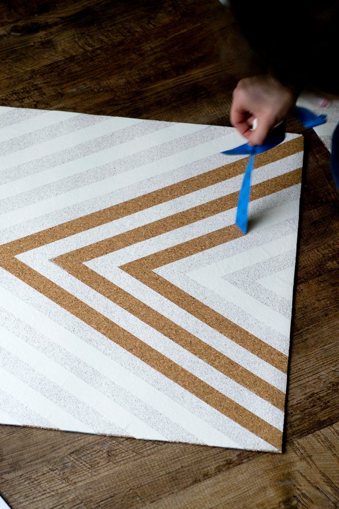 Наметьте узор с помощью малярного скотча. Чтобы создать узор с треугольниками, нужно начинать в середине внутреннего края, с самого маленького элемента и двигаться к углам. Используйте две полоски скотча — в месте пересечения полоски должны немного заходить друг на друга. Скотч удобно обрезать канцелярским ножом, ориентируясь на угол.